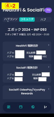 ![]() ① メイン画面 ・前日の報酬(VSCコイン獲得数) ・前日までのトータル獲得数 ②-1 ウォレット画面 ・VSCコイン数 ・USDV ・VAIトークン数 ・VDBトークン数 ・VSCXコイン数 ②-2 NFT画面 ②-3 Nodes画面(GPU NFT) ③ DAppブラウザー画面 ・NFTの購入 ・各デバイスの購入(ウォッチ) ④ HealthFi&SocialFi画面 ④-1 ハブコンソロール画面 ④-2 コミュニティ画面 ・HealthFi獲得数 ・SocialFi獲得数 ・直紹介したメンバーリスト表示 ④-3 ハブ画面 ・直紹介者のスロットル内訳 (ハブA又はハブB) ※自動測定頻度 ・レベル0➡6時間(Hekapro側は1時間) ・レベル1➡3時間(Hekapro側は1時間) ・レベル2➡1時間 ・レベル3➡30分 ・レベル4➡30分 |